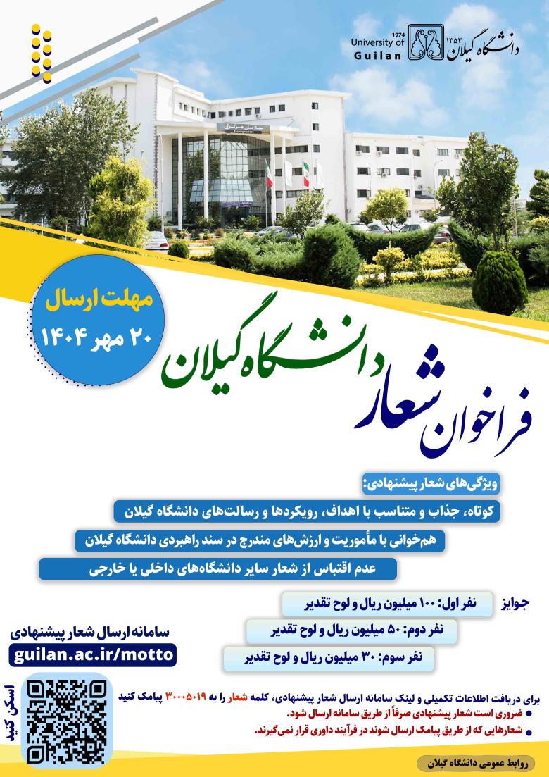 با توجه به اینکه انتخاب شعار برای دانشگاه‌ها یکی از شیوه‌های رایج در سطح ملی و بین‌المللی جهت معرفی، هویت‌سازی و برندسازی مراکز آموزش عالی به‌شمار می‌رود و می‌تواند رسالت، ظرفیت‌ها و چشم‌اندازهای دانشگاه را به‌روشنی در ذهن مخاطبان ترسیم کند؛ روابط عمومی دانشگاه گیلان در نظر دارد شعاری اختصاصی و الهام‌بخش برای دانشگاه انتخاب نماید. از کلیه دانشگاهیان گرانقدر و عموم مردم دعوت می‌شود تا شعار پیشنهادی خود را تا تاریخ 20 مهرماه 1404 از طریق سامانه مربوطه ارسال نمایند. 🔷 ویژگی‌های شعار پیشنهادی: کوتاه، جذاب و متناسب با اهداف، رویکردها و رسالت‌های دانشگاه گیلان / هم‌خوانی با مأموریت و ارزش‌های مندرج در سند راهبردی دانشگاه گیلان / عدم اقتباس‌ از شعار سایر دانشگاه‌های داخلی یا خارجی  لطفاً برای آشنایی بیشتر با مأموریت‌ها و چشم انداز دانشگاه گیلان و ارائه شعاری مناسب، سند راهبردی دانشگاه را مطالعه فرمایید.  «مشاهده سند راهبردی دانشگاه گیلان» 🔷 نمونه‌شعارهای دانشگاه‌های ملی و بین‌المللی: ​​​​دانشگاه تهران: میاسای ز آموختن یک زمان / دانشگاه تربیت مدرس: خرد باید و دانش و راستی / دانشگاه الزهرا: زن فرهیخته، جامعه بالنده / دانشگاه خوارزمی: آموختن برای زندگی بهتر دانشگاه کمبریج: دستاورد ما در اینجا فراگیری معرفت و دانسته‌های ارزشمند است / دانشگاه پرینستون: شکوفایی در پرتو انوار الهی / دانشگاه شیکاگو: بگذار تا دانش بیش‌تر و بیش‌تر رشد کند، تا زندگانی بشر غنی شود / دانشگاه پنسیلوانیا: قانون بدون اخلاق هیچ است / دانشگاه نیویورک: استقامت و پیشرفت 🔷 نحوه انتخاب: 📌 از میان شعارهای ارسالی، سه پیشنهاد برتر توسط کارگروه تخصصی انتخاب خواهد شد که در نهایت، یکی از آن‌ها به‌عنوان شعار رسمی دانشگاه گیلان برگزیده می‌شود.  📌 هر شرکت‌کننده تنها مجاز به ارسال دو شعار پیشنهادی است و در صورت ارسال بیش از دو پیشنهاد، در فرآیند داوری شرکت داده نمی‌شود. 📌 ضروری است شعار پیشنهادی صرفاً از طریق سامانه ارسال شود. 📌 شعارهایی که از طریق پیامک ارسال شوند در فرآیند داوری قرار نمی‌گیرند. 📌 شایان ذکر است انتخاب شعار دانشگاه، منوط به تأیید نهایی کارگروه تخصصی بوده و در صورت عدم تطابق شعارهای پیشنهادی با معیارهای اعلام‌شده، احتمال دارد هیچ‌یک از پیشنهادهای ارسالی به‌عنوان شعار رسمی دانشگاه انتخاب نشود. 🎁 جوایز برگزیدگان: نفر اول: 100 میلیون ریال و لوح تقدیر / نفر دوم: 50 میلیون ریال و لوح تقدیر / نفر سوم: 30 میلیون ریال و لوح تقدیر 📞 در صورت هرگونه سوال یا ابهامی می‌توانید با شماره 01333690571 روابط عمومی دانشگاه گیلان تماس حاصل فرمایید.  دانشگاه گیلان در شبکه‌های اجتماعی  پیام‌رسان ایتا   پیام‌رسان سروش  پیام‌رسان بله