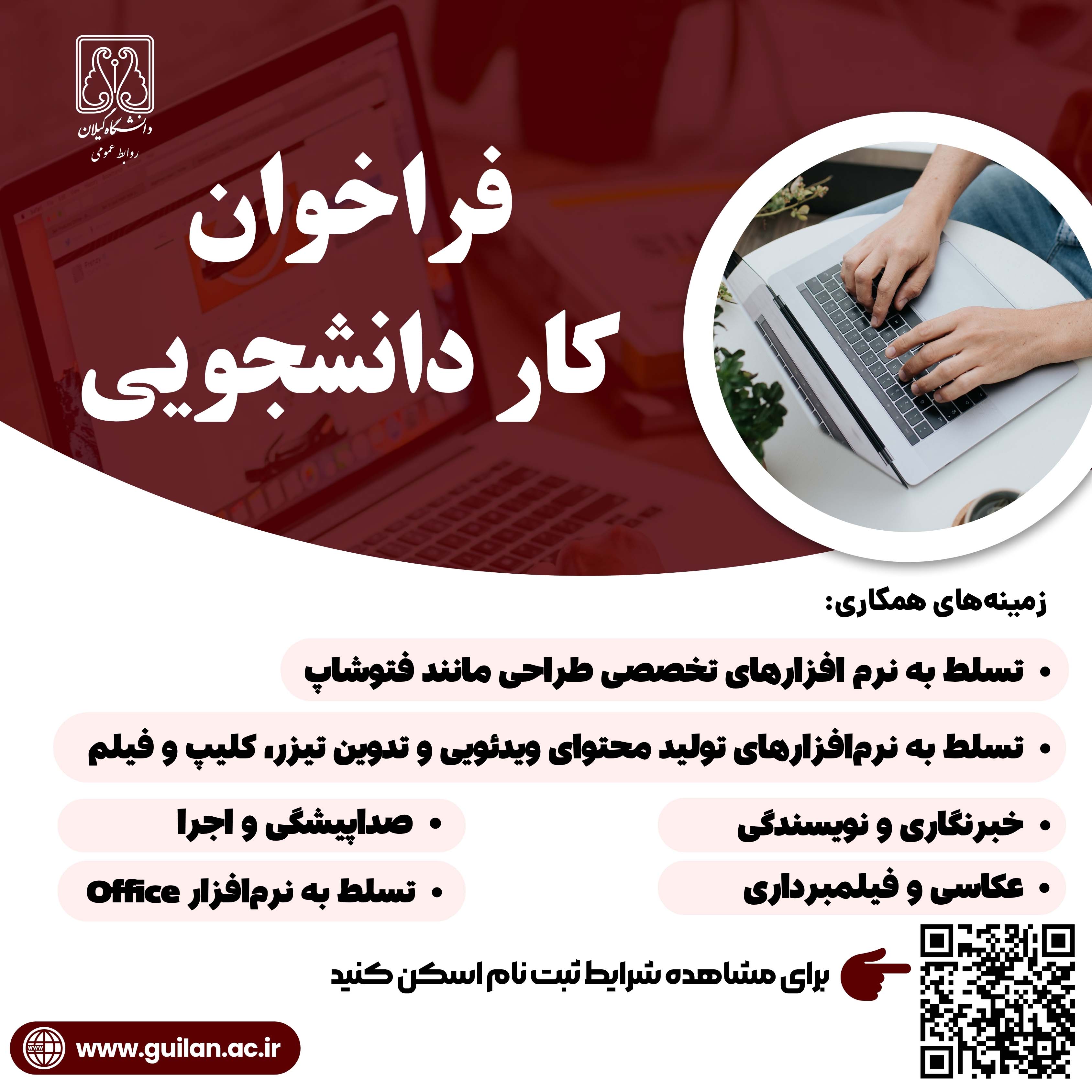 از دانشجویان ورودی 1401 و بعد از آن که علاقمند به فعالیت به عنوان کار دانشجویی می‌باشند در زمینه‌های زیر دعوت به همکاری می‌شود.