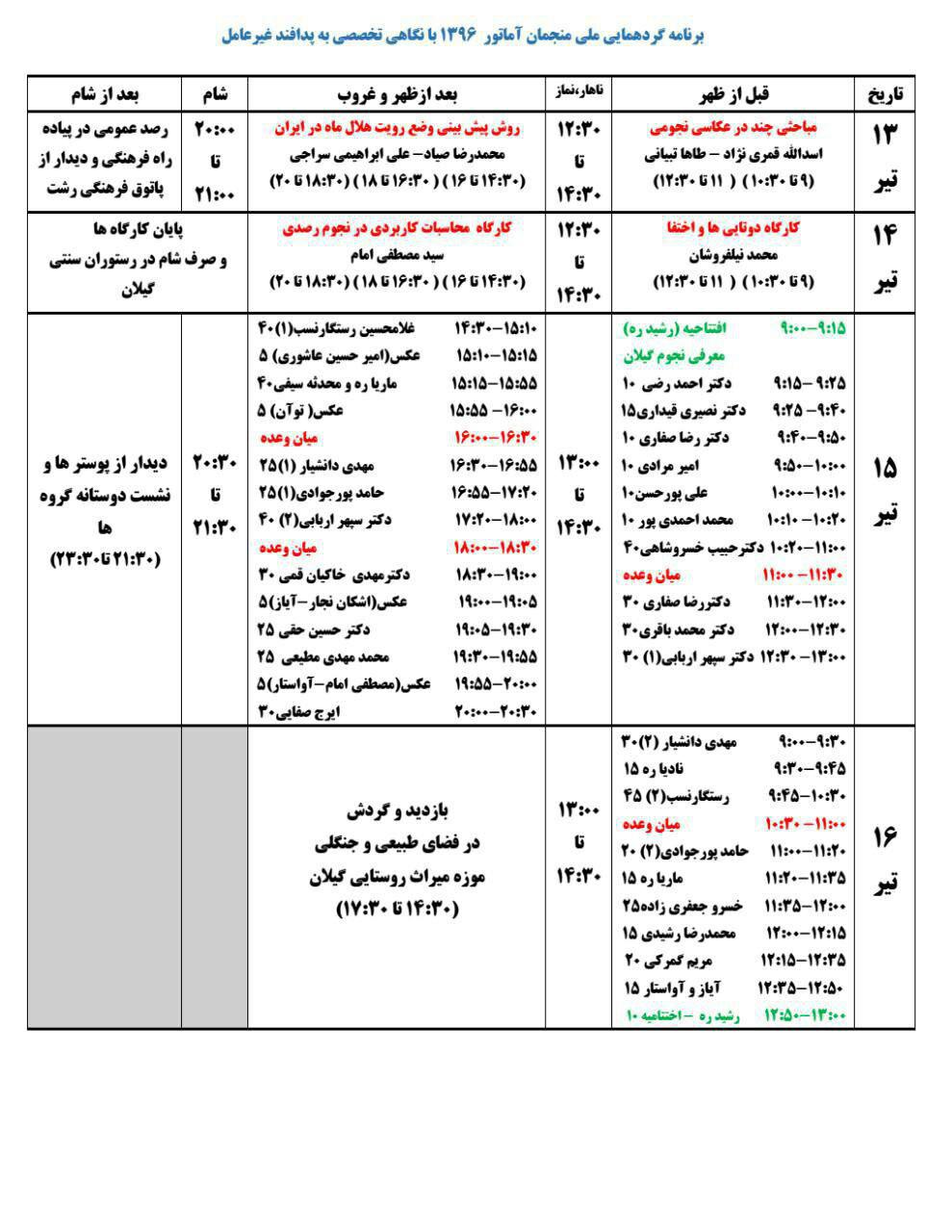 "گردهمایی ملی منجمان آماتور در سال 1396 با نگاه تخصصی به پدافند غیرعامل" با همکاری دانشگاه گیلان از تاریخ 13 الی 16 تیرماه در استان گیلان برگزار می شود. به اطلاع کلیه دانشجویان و دانش آموزان استان گیلان می رساند، امتیاز برگزاری برنامه امسال طی ۴ روز از طرف انجمن نجوم ایران به جامعه نجوم گیلان واگذار شده و برنامه مذکور با یاری دانشگاه گیلان، پدافند غیرعامل استان و شهرداری رشت برگزار خواهد شد. لذا این امکان حاصل شده تا دانشجویان و اعضای هیات علمی علاقه مند کلیه رشته های دانشگاه گیلان (به صورت رایگان و با تقبل هزینه های مرتبط از سوی دانشگاه) در هر ۴ روز برنامه مذکور حضور داشته باشند و از سخنرانی دانشمندان و فرهیختگان نجوم کشور، بهره ی لازم حاضر را ببرند. گردهمایی امسال با رونمایی از عنوانی جدید از نجوم، "ارتباط نجوم با پدافند غیرعامل" همراه خواهد بود که شامل موارد ذیل است: - برخورد شهاب سنگها - اشعه های خورشیدی -تاثیرات ماه و خورشید بر زمین - ماهواره ها - آلودگی های نوری و صوتی - مواد مصرفی در پایگاه های فضایی - پزشکی فضایی و نجومی - تغییرات در اقلیم زمین - حرکت هواپیماها و فضا پیماها - رویت هلال ماه - جو زمین - زباله های فضایی - تجهیزات الکترونیکی (navigation) - هواشناسی - مخابرات و اینترنت - دسترسی به خاک سایر سیارات - عکاسی نجومی و مشاهدات عجیب - نجوم کروی و موارد دیگر که تا کنون مورد توجه همه کشورهای توسعه یافته بوده و می باشد. از فرهیختگان نجوم کشور، اساتید، دانشجویان و دانش آموزان دعوت به عمل می آید تا ضمن شرکت در برنامه ی فوق در ارائه بهترین تعاریف در راستای ارتقا امنیت و صلح بشریت با پدافند غیرعامل کشور همراهی نمایند. همچنین پس از گذراندن دوره ۴ روزه، به هر شرکت کننده دو مدرک ملی اعطا خواهد شد؛ یکی مخصوص دو روز اول گردهمایی که ویژه ۴ کارگاه تخصصی است و دیگری به جهت حضور در سمینار دو روزه به همراه دانشمندان نجوم کشور.
